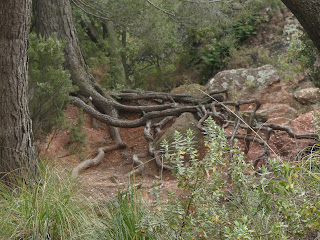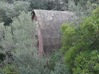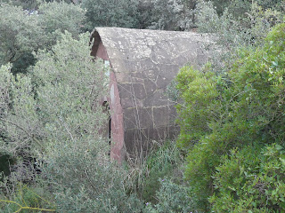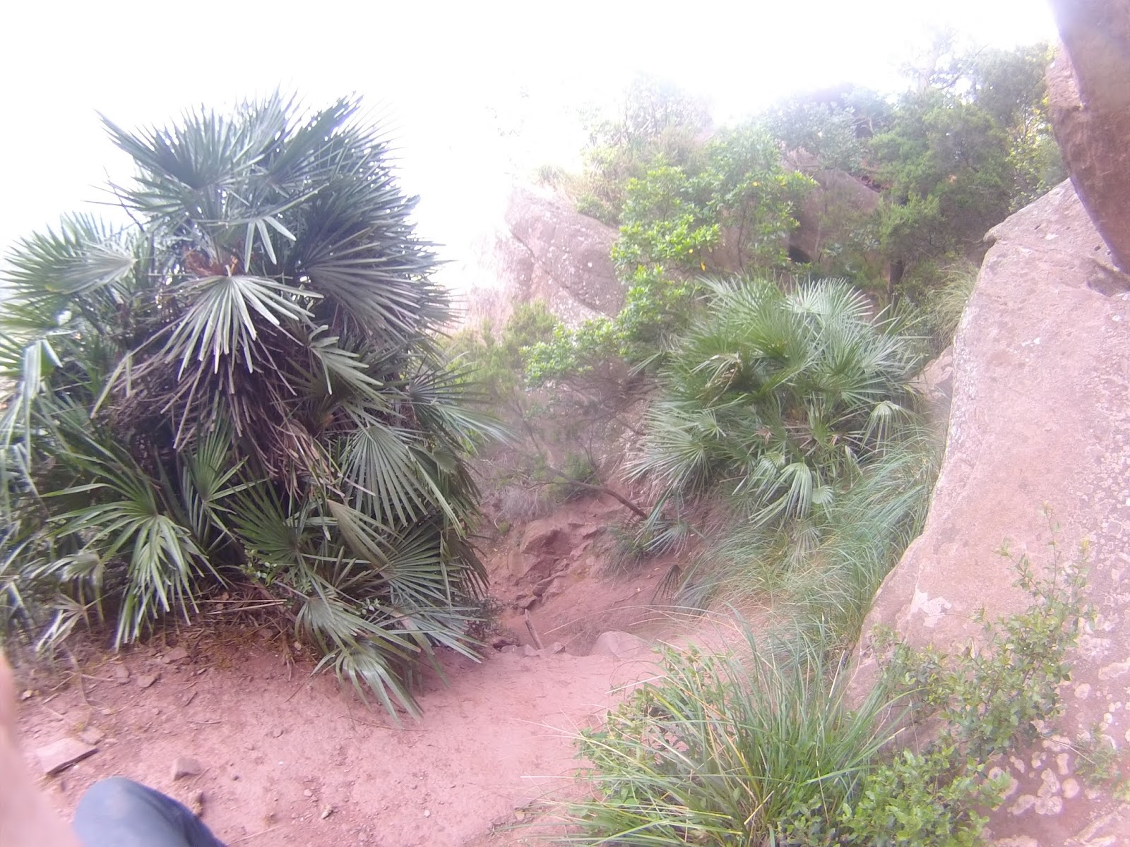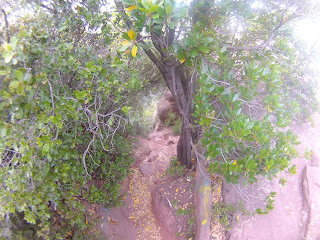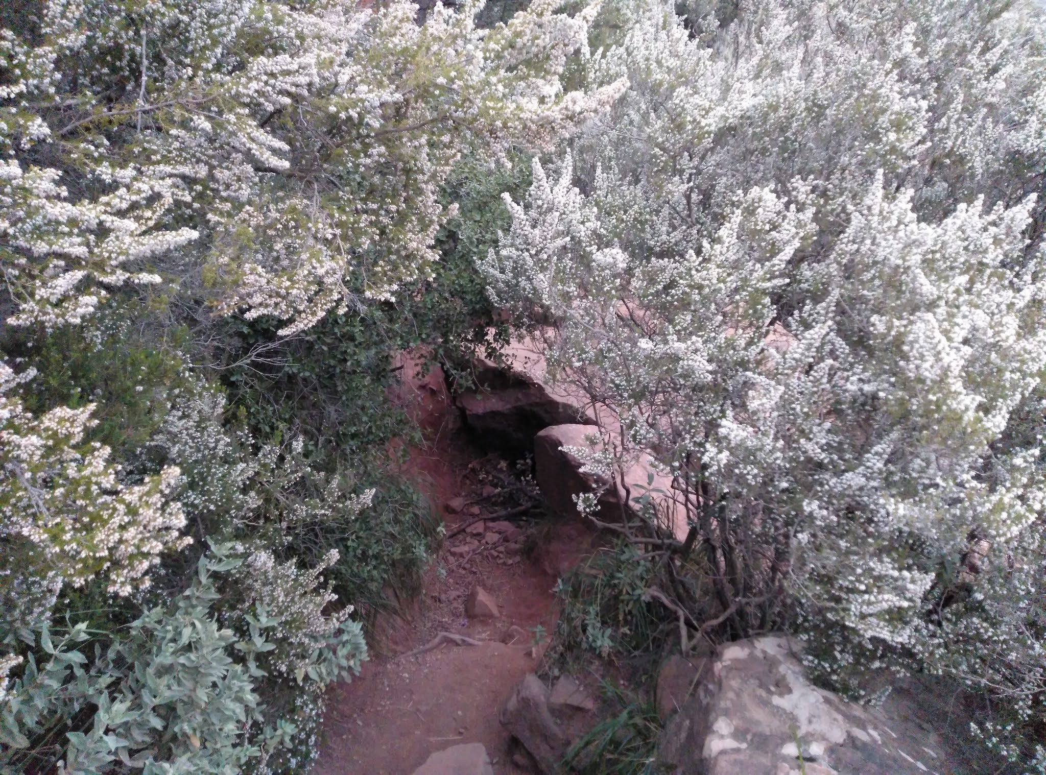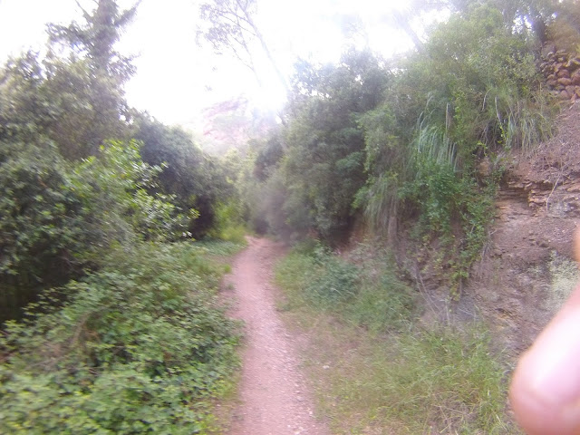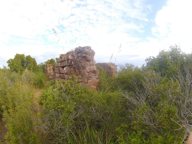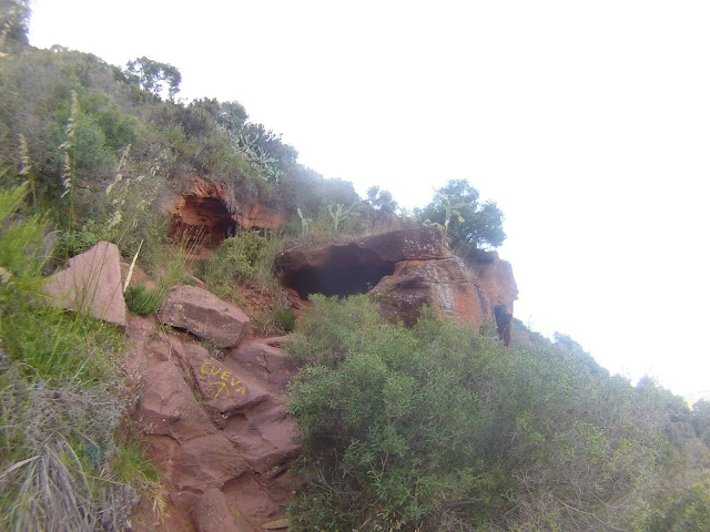 Nosotros primero nos acercamos a la cueva, por lo que cogemos el sendero que hay entre la vegetación y que va serpenteando todo el risco, es intuitivo ya que se ve por donde ha pasado la gente, hasta llegar a unas ruinas.
