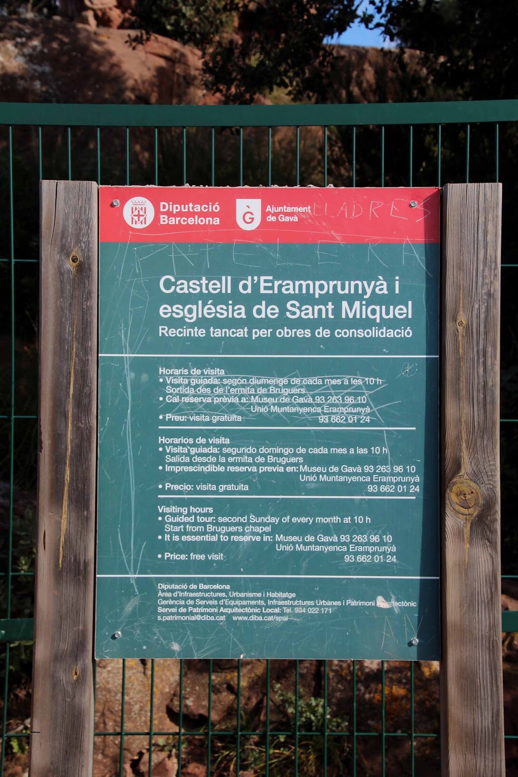 En el recinto soberano, está rodeado por muros que en muchos tramos tenía 50 cm de espesor hechos con pequeños sillares, se accedía a través de un puente de piedra (actualmente se realiza por una pasarela de madera). El baluarte que defendía el portal tiene un espesor de 90 cm al paramento más meridional. El castillo es citado por primera vez en el año 957. /br> La ermita de Sant Miquel de Eramprunyá tiene dos partes: una románica (el ábside y el presbiterio), del siglo XII, y una de renacentista, del 1509 (la nave, el coro y la portada). Alrededor de la ermita se pueden ver tumbas antropomorfas y también una inscripción en la roca realizada por Jaume March I, señor de Eramprunyá,