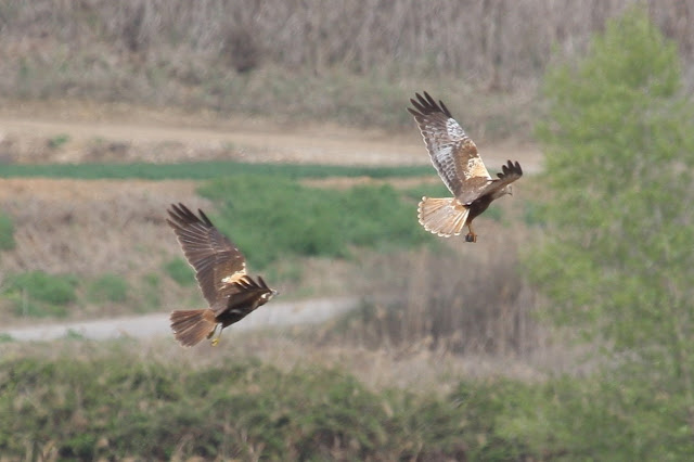Las aguiluchos ya están en pleno período reproductor. En este caso la hembra sale del nido a perseguir el macho que llega con una toma en las patas. 04/12/2018, (c) Anna Varea & Juan Rodríguez.