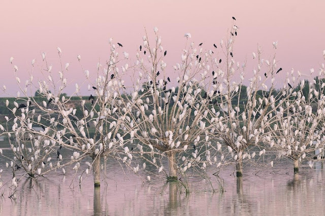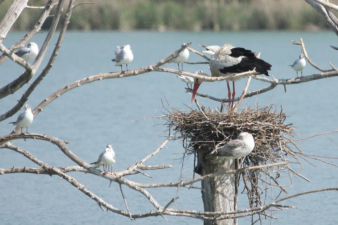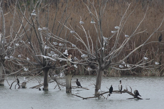 Cormoranes grandes y gaviotas reidoras comparten posadero los árboles muertos que aún se mantienen derechos en el interior del estanque. 04/12/2018. (C) Anna Varea & Juan Rodríguez.
