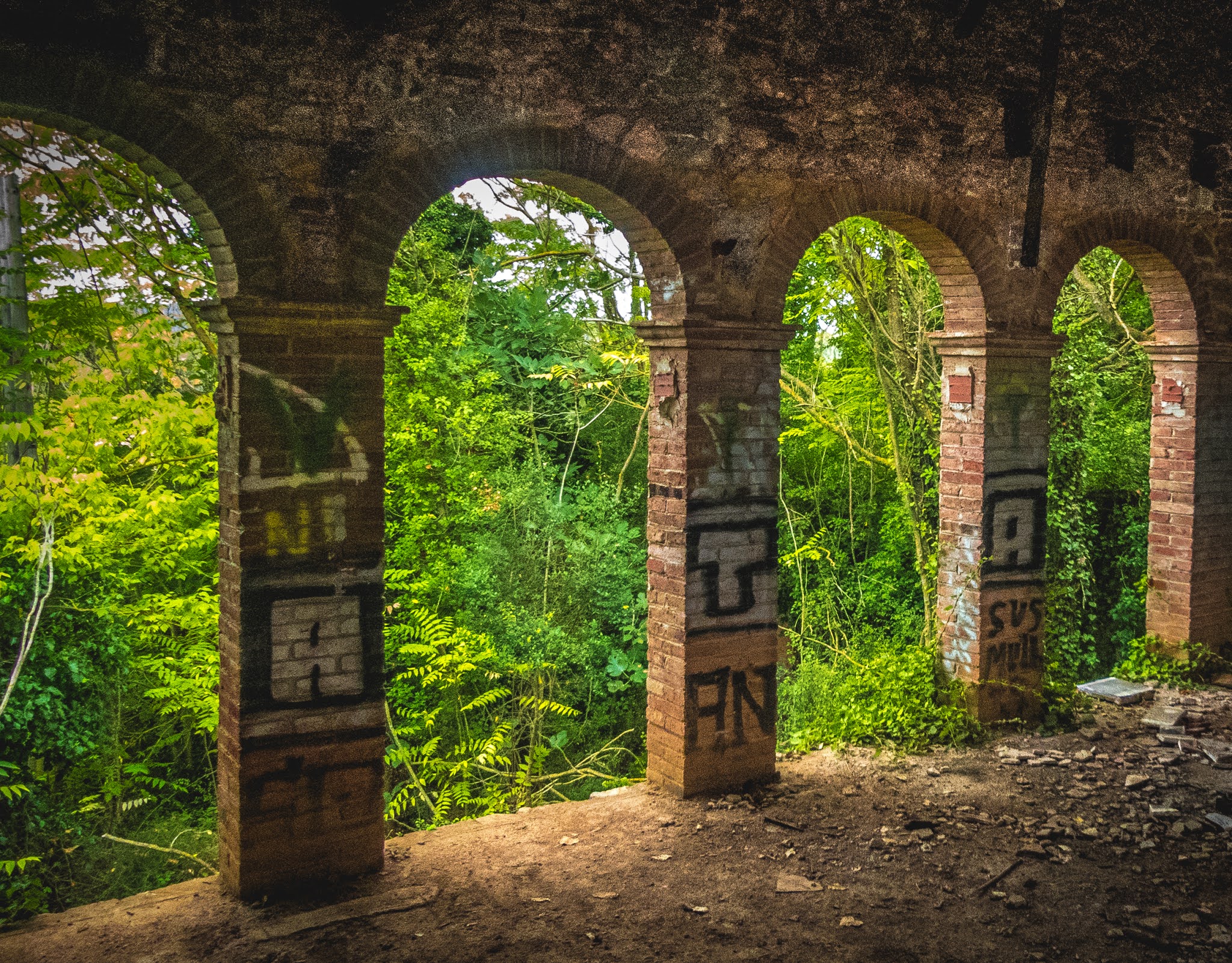 Puente natural originado por erosión eólica en los conglomerados del Buntsandstein. Afloramiento en el camino de la GR – 92, que da acceso a las ruinas y a la ermita.