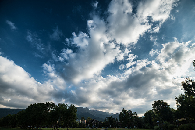 Digamos que el horizonte de la imagen no debe estar en el centro del rectángulo, sino que más bien debería estar por debajo del margen central. De esta forma, veremos más cielo que tierra y veremos una actuación más importante de las nubes en fotografía, incluso si las mismas no son las protagonistas. Podemos incluso tomar otros centros de interés ubicados en la tierra, haciendo que nuestras nubes jueguen el papel de reforzadores. Otro aspecto que influye al momento de componer nubes en fotografía es la dirección que estas toman. Cuando tenemos un lente gran angular, lógicamente es un poco más fácil hacernos con más posibilidades de líneas compositivas. Generalmente, gracias a la distorsión del objetivo, se logra una perspectiva congruente en la que las nubes se dirigen hacia los bordes de la foto. Todo depende de la hora del día, de las condiciones del cielo y demás.