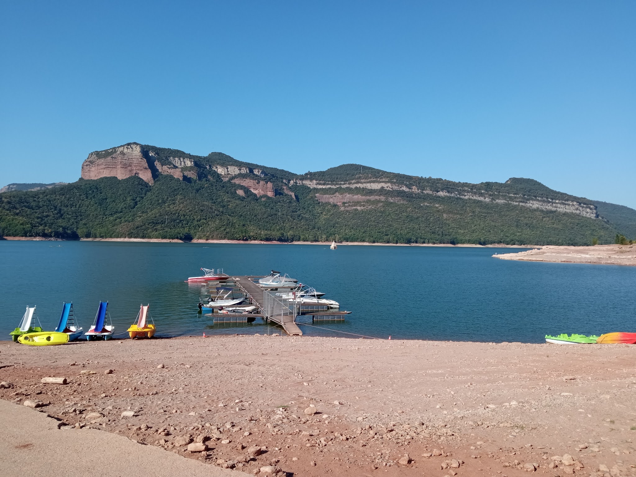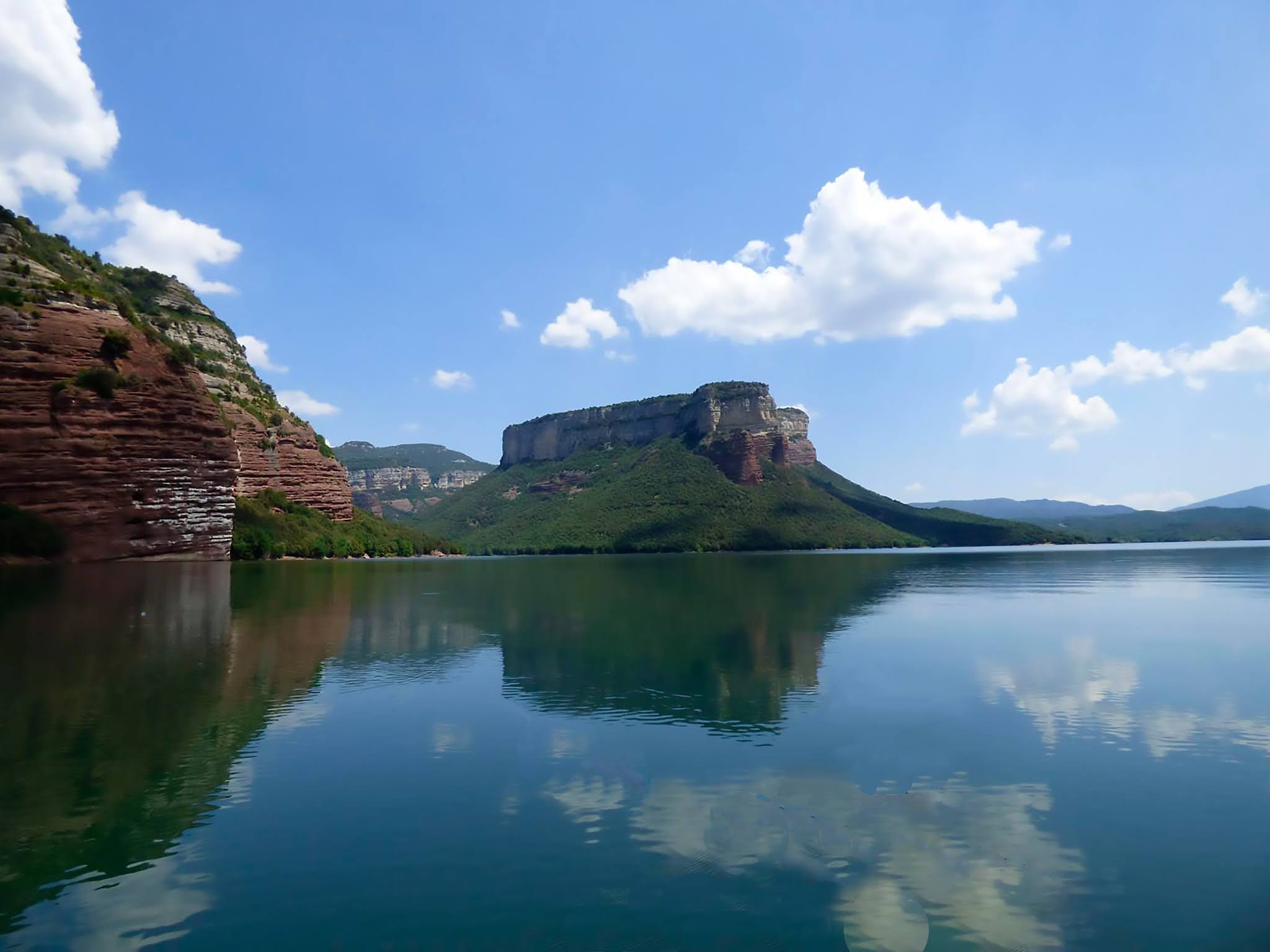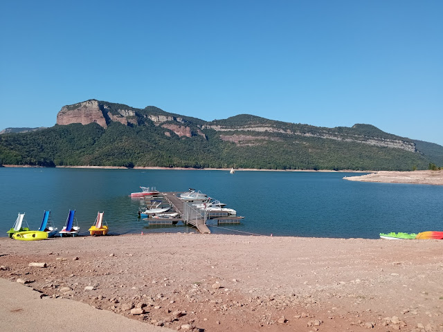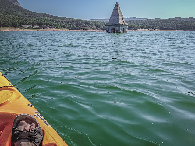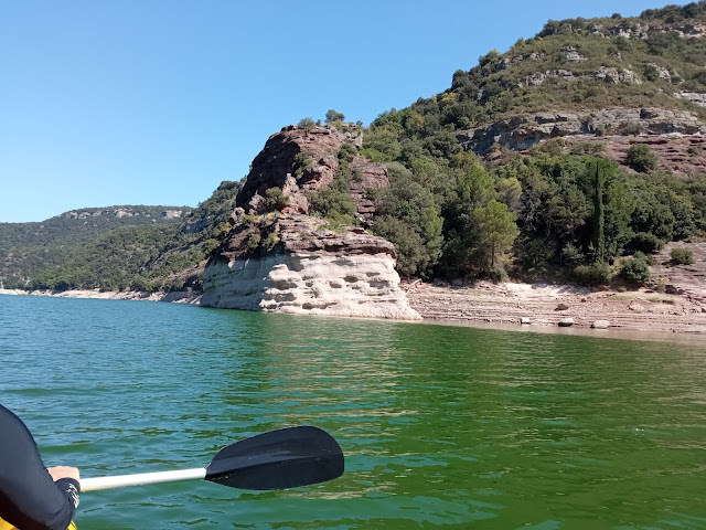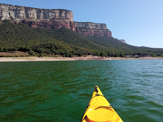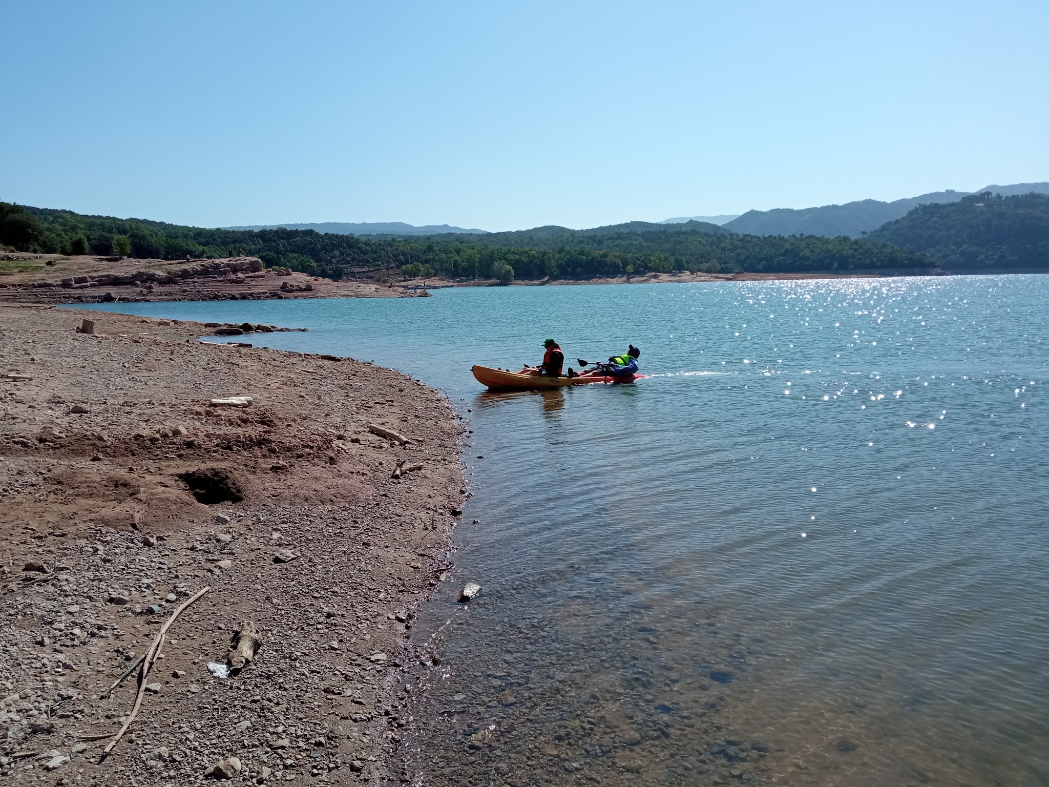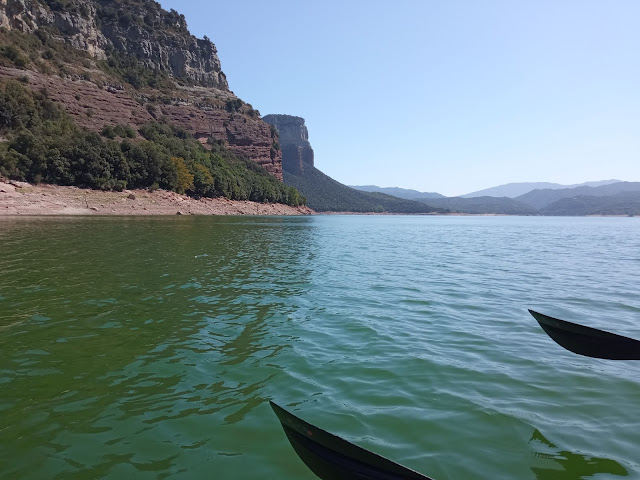 Salida desde el Club Naútico de Vic, primera visita obligada al campanario, pocas veces se puede observar tan fácilmente la cubierta de un campanario románico, después de unos 'incidentes' vuelta a la orilla y recorrido por el medio del pantano hasta el Cingle de la Sarment, vuelta cerca de la orilla para una visión única de los acantilados recorriendo las moles inmensas que se sumergen en las aguas, el brazo Balà, en donde se estrecha el camino y se pone muy vertical, justo debajo del mirador del Morro de l'abella. Un paraje espectacular al pie de los acantilados característicos de Tavertet y 2 horas remando tranquilamente. Es navegable a través de los meandros llegar hasta Roda de Ter (14 km) Hay 3 tipos de kayaks, de una, dos o tres plazas, el de una plaza requiere una cierta experiencia pues es algo mas inestable, el de tres plazas está pensado para 2 adultos y un niño, en ningún caso 3 adultos, no está permitido acercarse a la presa.