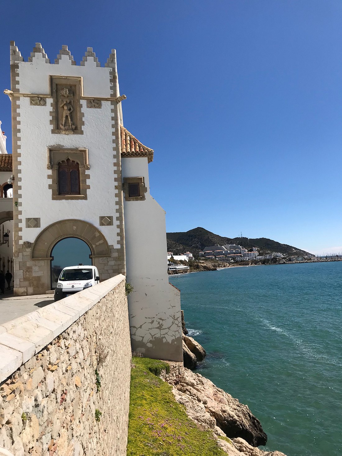 El paseo marítimo de Sitges tiene algo más de 2 kilómetros de longitud es muy agradable pasear por él con la icónica Iglesia de San Bartolomé y Santa Tecla de fondo y las diversas calas del mar a su costado. Disfrutando del Mediterráneo al máximo.