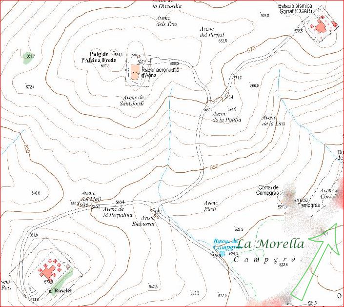En la la zona superior de Garraf tenemos una altiplanicie de una gran extensión, de una gran riqueza geológica, en la que predomina el paisaje kárstico y sus derivadas internas, las simas (avencs), que desembocan en cuevas de grandes profundidades, algunas incluso enlazan en su interior con el mar. La Falconera.Aunque este recorrido se inicia desde el aparcamiento y mirador del Pla de Querol, podemos aprovechar la subida por el Ratpenat para ir apreciando todas la estructura del macizo, y disfrutar de una serie de miradores el mas importante Puig del Martell, hay que ir con cuidado sobre todo las primeras rampas en curva, 26% de pendiente, en cada repecho, nos va introduciendo curva a curva en pleno parque de Garraf, pero siempre con la vista en Port Ginesta y la extensa playa de Castelldefels en toda su amplitud. El objetivo de esta ruta es pasar por los avencs mas importantes, señalizados y estudiados, aunque la ruta está perfectamente marcada GR (blanca y roja), excepto la primera sima, y las visitas a las ruinas y al dolmen, aunque el desnivel no es bastante importante debido a que la parte dura del puerto de montaña lo hemos hecho con el coche, el desnivel es suave y pasando por el recorrido serpenteante de las simas nos encontramos con 5 de cierta importancia, algunas de ellas de hasta 90 metros de profundidad, avenc de la Silvia, avenc dels Llambrics, avenc de Lluis Solà, avenc de l'Asensi, con postes indicativos y desde luego prohibido introducirse o caerse dentro bajo ningún concepto, por peligro de intoxicación (hipoxia), iremos a una de las cumbres emblemáticas del macizo, La Morella, el Rascler, centro de antenas, radares aeronáuticos, comunicaciones y estación sísmica, están agrupados en varias cimas entre Morella y Rascler, la cima donde está la caseta de la estación del radar aeronáutico del Garraf es el Puig Ginebrò, la famosa bola. Aquí el mapa topo para resolver qué es el qué y donde está: